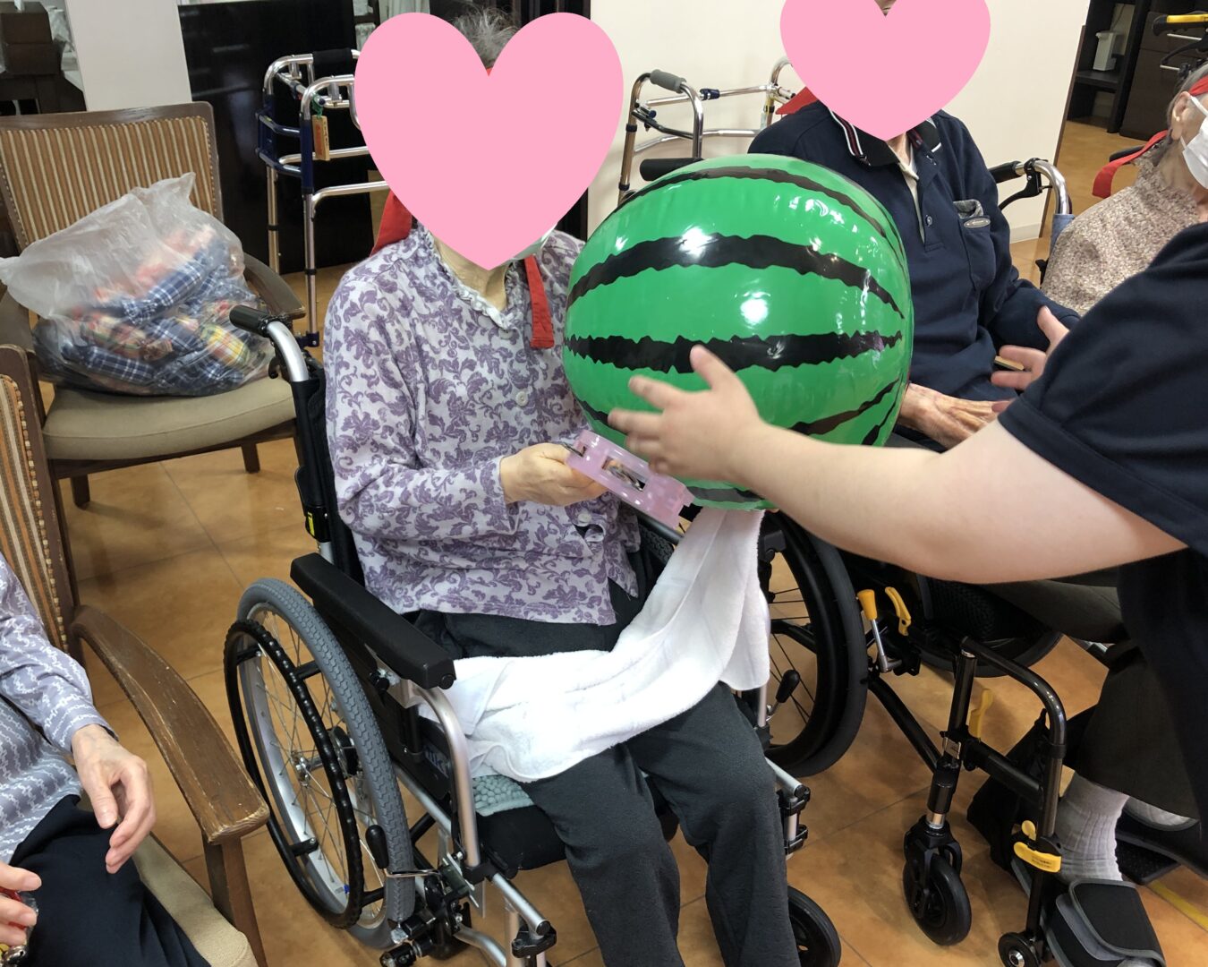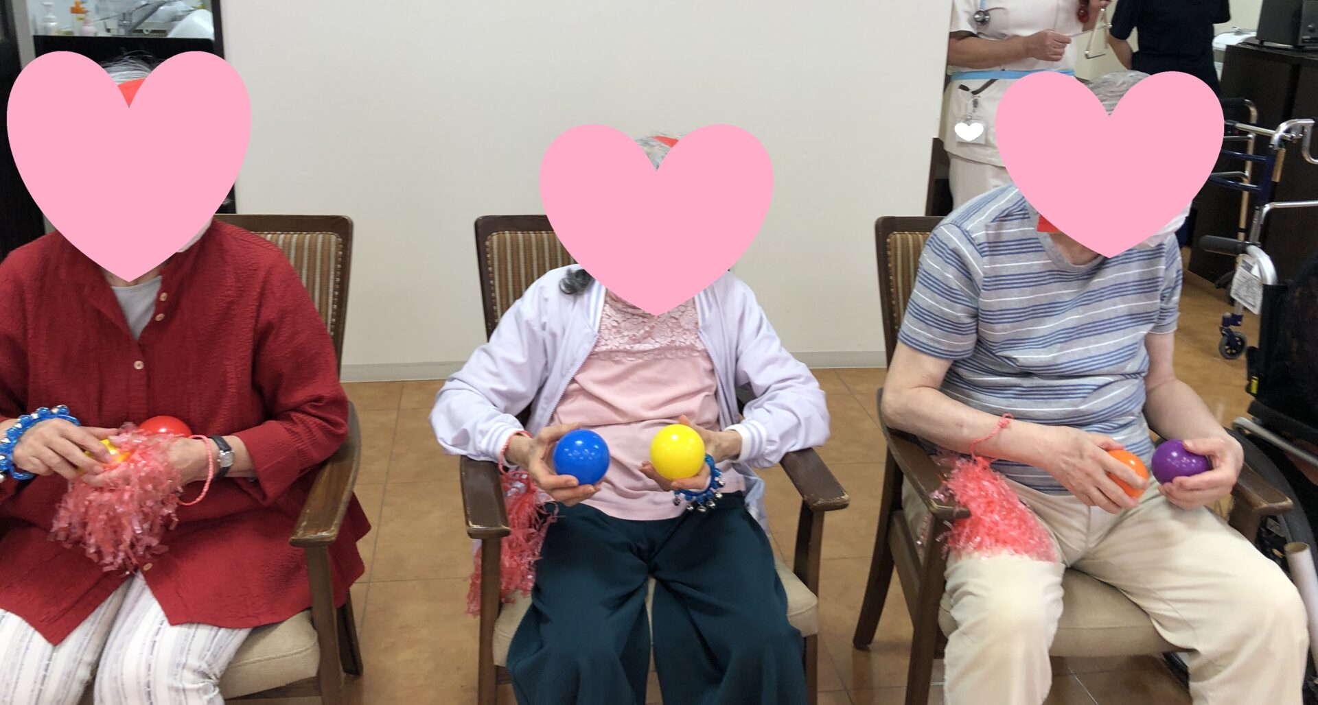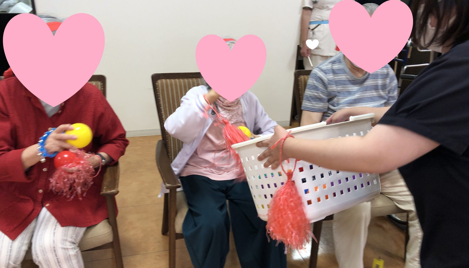 安全面を考慮して、椅子に座りながら玉入れを行います
