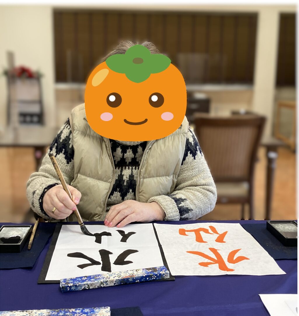 書と向き合うご入居者様。スタンプの下の表情は真剣そのもの。
